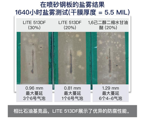 LITE 513DF是一款基于腰果殼油的新型高生物含量稀釋劑,它的環(huán)氧當(dāng)量比標(biāo)準(zhǔn)的513型號(hào)要低。這款產(chǎn)品適用于環(huán)氧涂料、單組分和雙組分粘合劑以及復(fù)合材料。LITE 513DF粘度低,具有優(yōu)異的稀釋能力,與雙酚A型液體環(huán)氧樹脂的添加重量曲線如圖所示。作為稀釋劑,它在環(huán)境溫度和低溫下具有良好的硬度發(fā)展。與其他腰果殼油改性的材料類似,LITE 513DF具有良好的耐水性和柔韌性。在涂料應(yīng)用中,LITE 513DF在長(zhǎng)期鹽霧試驗(yàn)中表現(xiàn)出非常好的防腐性能,請(qǐng)見本頁(yè)面板的圖片。在粘合劑應(yīng)用中,這種環(huán)氧稀釋劑還可作為改性劑,提高伸長(zhǎng)率和粘結(jié)強(qiáng)度,同時(shí)將對(duì)Tg和抗拉強(qiáng)度的影響降至低。